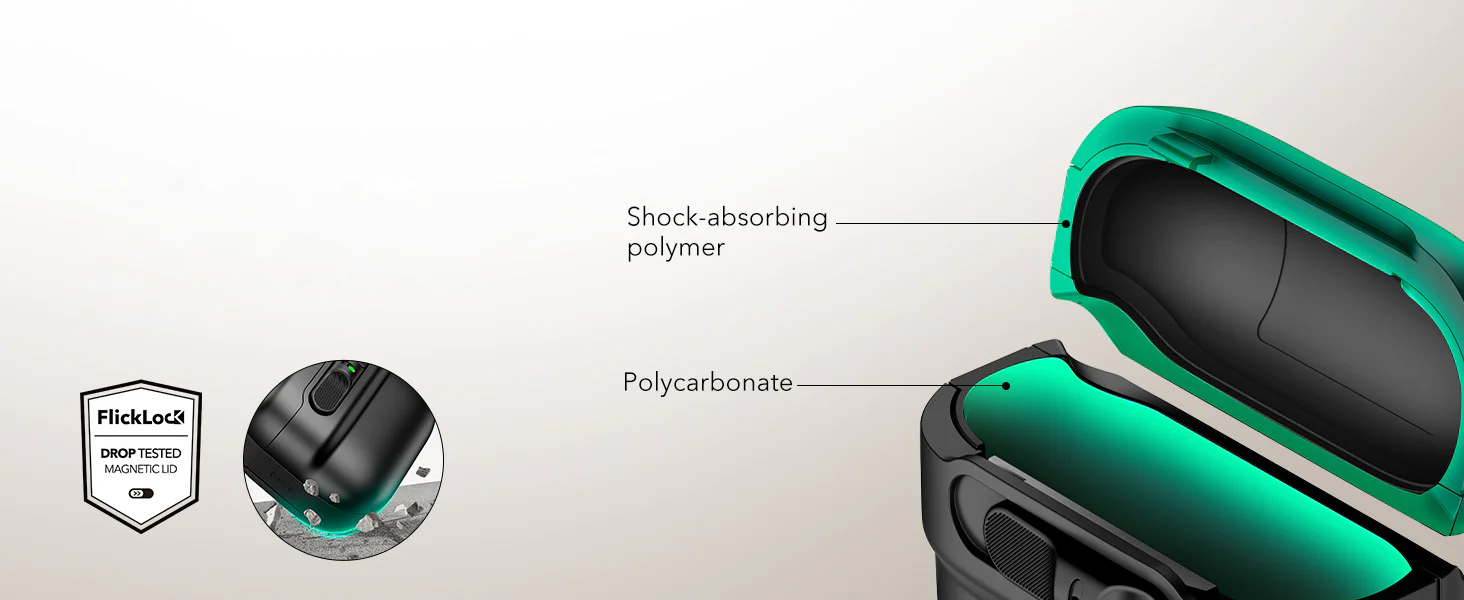 Drop-Proof FlickLock: Strong magnetic lid with 650 g of holding force and an internal latch securely locks your AirPods in place, while the FlickLock allows easy, automatic opening
